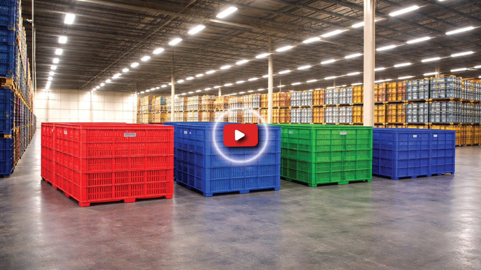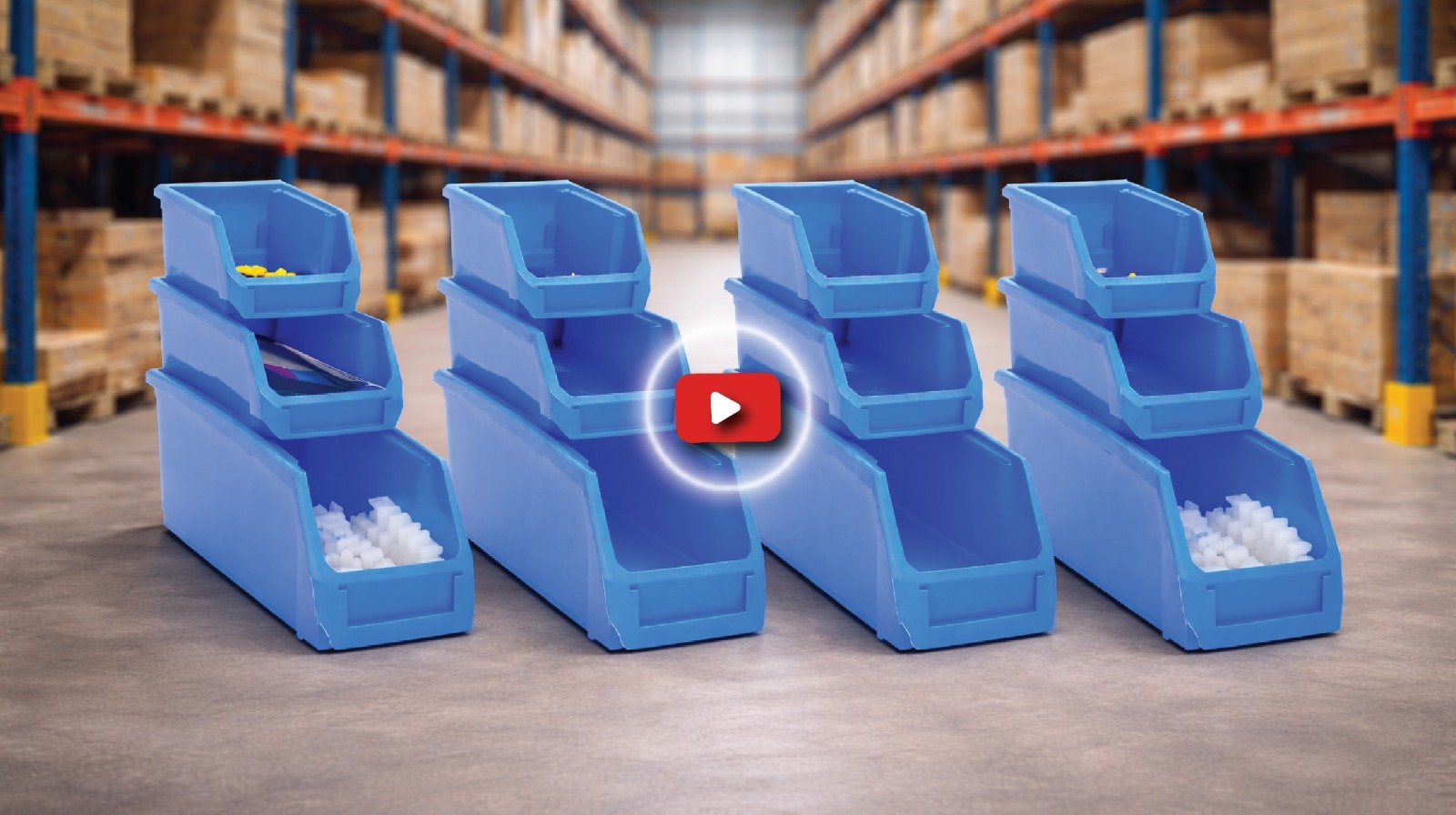 Heavy-duty plastic bins used for efficient warehouse organization and material handling in local industrial applications.