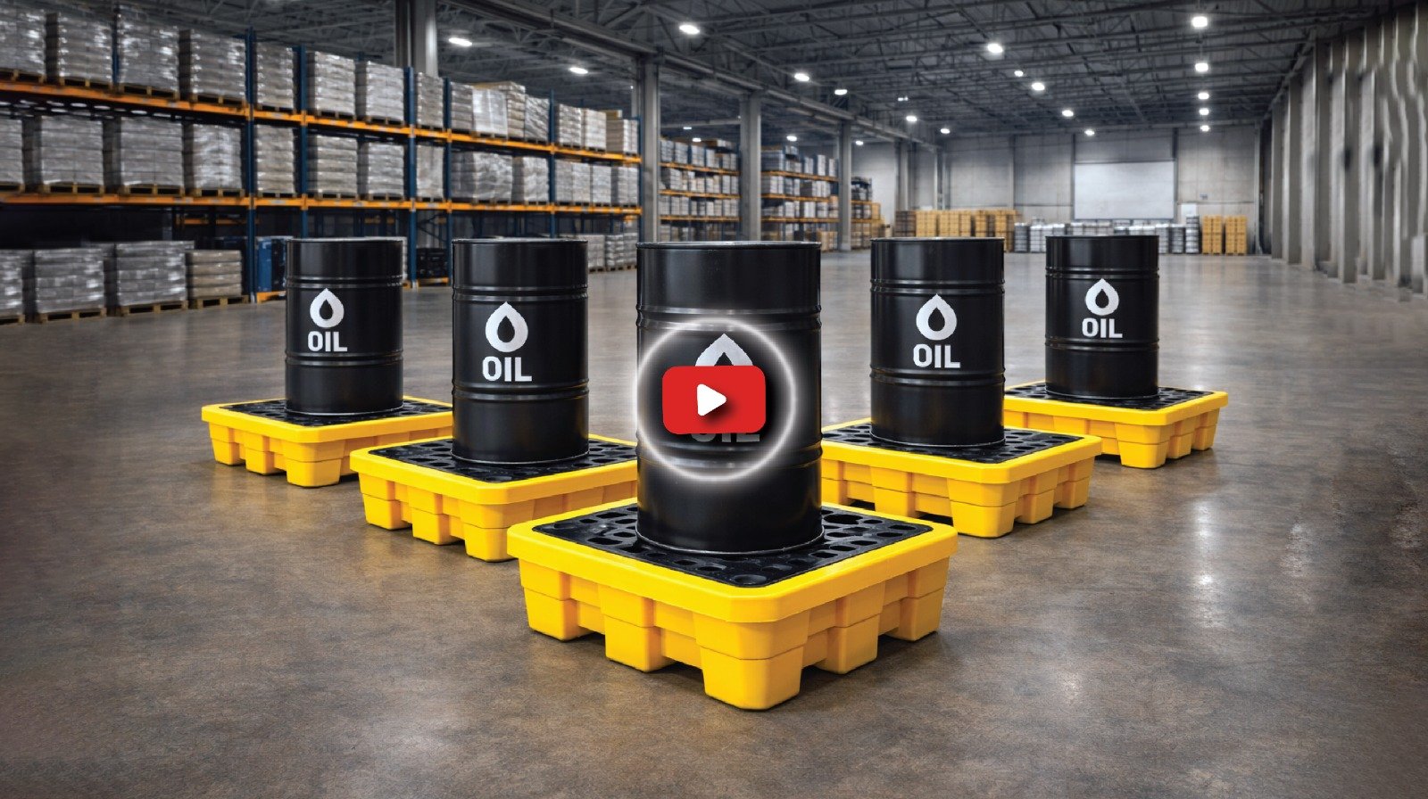 Spill containment pallets designed for safe drum storage, helping prevent chemical leaks in industrial and warehouse environments.