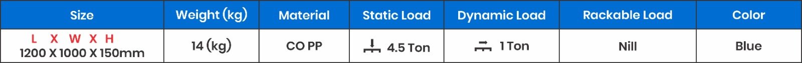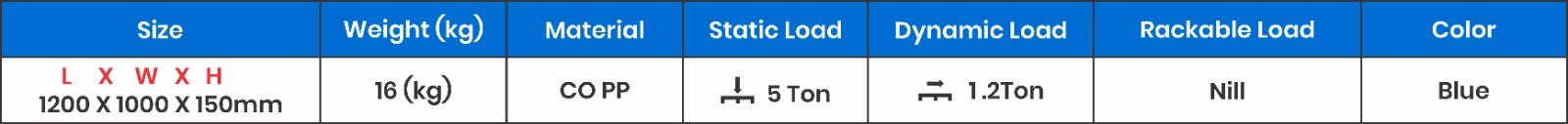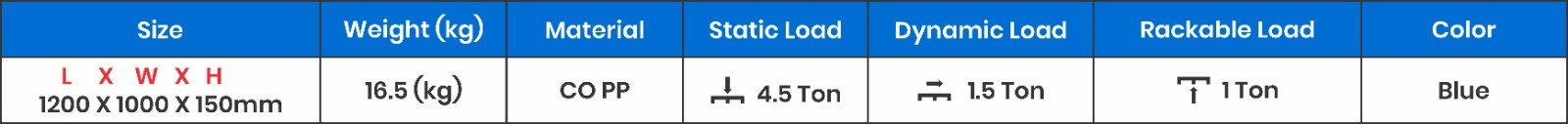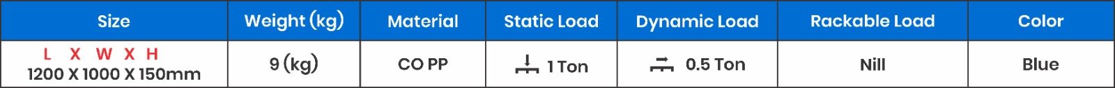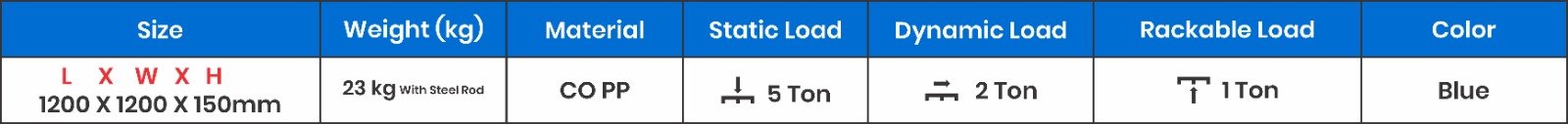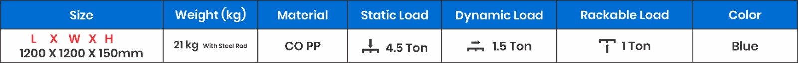 Reinforced with 5 steel rods, this high- performance pallet is build for maximum strength and long- term continuity. Made with premium COPP material for industrial applications.